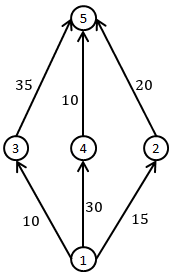 Using the above flights has changed the available capacity for links between the airports that are involved, so we update the flow network weights, subtracting $5$5 from each weight.