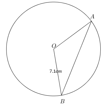 Consider a circle with centre $O$O and a chord $AB$AB subtended by an angle of $\theta$θ radians at the centre. The radius is $30$30 cm and the area of sector $OAB$OAB is $75\pi$75π cm2.