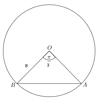 The diagram shows a circle with radius $8$8 units, and chord $AB$AB subtending an angle of $\frac{\pi}{3}$π3 radians at the centre.