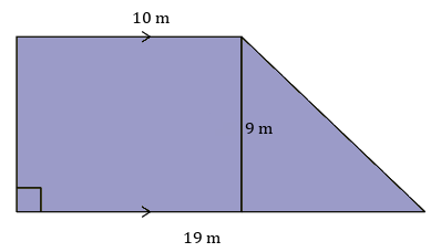 A right-angled trapezium is shown, shaded in purple. The trapezium consists of a rectangle and a right-angled triangle on its right side. The trapezium has a bottom base measured 19 m and a top base measured 10 m. The height of the trapezium, hence also that of the rectangle, is measured 9 m.