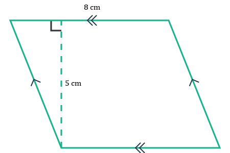 A green-outlined parallelogram has its base and height labeled. The top and bottom sides of the parallelogram are marked with double arrowheads. The left and right sides of the parallelogram are marked with single arrowheads. The top side of the parallelogram, which is its base, is labeled $8$8 cm. The height of the parallelogram, represented by a dashed vertical line segment extending from the top side down to the bottom-left vertex, is labeled $5$5 cm. A small square marks the intersection of the dashed line segment and the top side.