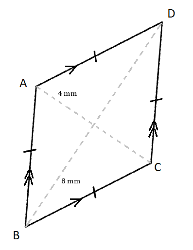 $\text{Area of a rhombus }=\frac{1}{2}\times\text{diagonal }x\times\text{diagonal }y$Area of a rhombus =12×diagonal x×diagonal y