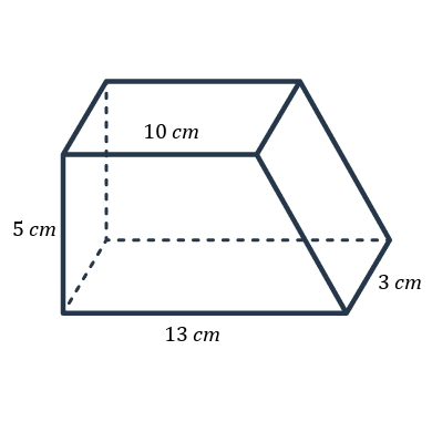 A triangular prism with both the top and bottom bases as right-angled triangles, indicated by small square symbols at the vertices with the right angles. The three sides of the top triangular face are labeled with their lengths. The two shorter sides that form the right angle are labeled $3$3 cm and $4$4 cm. The longest side, the hypotenuse, is labeled $5$5 cm. The height of the prism, represented by the length of the vertical edges connecting the bases, is labeled $19$19 cm. Visible edges are drawn with solid lines, while hidden edges are represented with dashed lines.