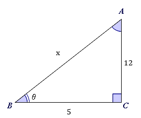 A right-angled triangle with vertices labeled $A$A, $B$B, and $C$C. Each of the non-right angles at vertices $A$A and $B$B is marked with a small arc near the vertex. Vertex $C$C has a right angle, indicated by a small square corner. An angle $\theta$θ is indicated at vertex $B$B. Side $BC$BC is labelled 5 and is adjacent the angle theta. Side $AC$AC is labelled 12 and is opposite the angle $\theta$θ. Side $AB$AB is the hypotenuse and labelled x.