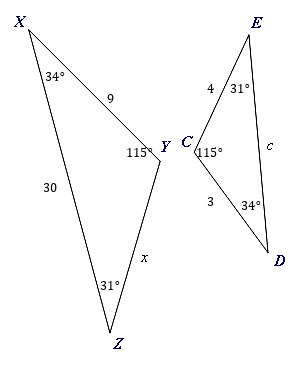 The sides lengths of similar shapes are in the same ratio or proportion. So once we know that two shapes are similar, we can solve any unknown side lengths by using the ratio.