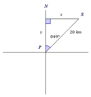 The position of a ship S is given to be $20$20 kilometres from P, on a true bearing of $0$0$49$49$^\circ$°T.