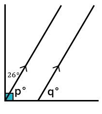 Two parallel diagonal lines are intersected by a horizontal transversal such that the parallel lines are right on top of the transversal. The parallel lines are marked with single arrowheads. The parallel line on the left intersects the left endpoint of the transversal line, forming an angle marked as $p$p degrees. To the right is the other parallel line and it forms an angle marked as $q$q degrees with the transversal line. Both the $p$p-degree and $q$q-degree angles are above the transversal and on the right side of their respective parallel lines, indicating that they are corresponding angles. At the left endpoint of the transversal line, a vertical line extends, forming a right angle as indicated by a blue square. At the same time, the vertical line forms an angle with the left parallel line, and it measures $26^\circ$26° as labeled.