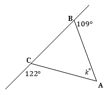 A triangle has its vertices labeled $A$A, $B$B, and $C$C. Vertex $A$A is on the bottom right. Vertex $B$B is at the top. Vertex $C$C is on the bottom left. The interior angle at vertex $A$A, $\angle BAC$∠BAC, is labeled $k$k degrees. The side $BC$BC extended on both ends, forming two exterior angles at vertices $B$B and $C$C. The exterior angle at vertex $B$B measures $109^\circ$109°. The exterior angle at vertex $C$C measures $122^\circ$122°.
