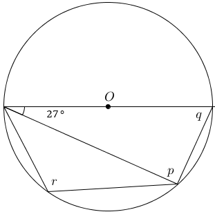 A quadrilateral is inscribed in a circle, with its top side being the circle's diameter. A diagonal is drawn from the top-left vertex to the bottom-right vertex of the quadrilateral, forming two triangles, one on top of the other. In the top triangle, the sides are the diameter of the circle, the diagonal of the quadrilateral and the right side of the quadrilateral. The interior angles of the top triangle are labeled. The top-left angle, the angle between the diameter and the diagonal, is labeled as $27^\circ$27°. The top-right angle, the angle between the diameter and the right side, is labeled $q$q degrees. The bottom-right angle, the angle between the diagonal and the right side, is labeled as $p$p degrees. The $p$p-degree angle is inscribed in a semi-circle. The bottom-left angle of the quadrilateral is labeled as $r$r degrees. The $r$r-degree and the $q$q-degree angles are opposite angles of the inscribed quadrilateral.